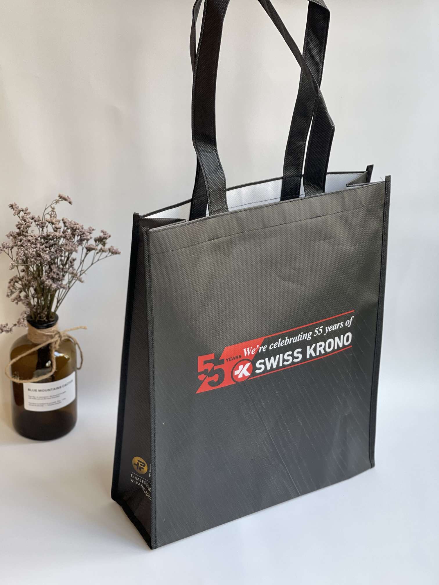 用這種方法加工的成品通常叫復(fù)膜無紡布袋。此工藝分兩步,即先采用傳統(tǒng)的凹版印刷工藝將圖文印至薄膜上,再采用覆膜工藝將印有圖案的薄膜復(fù)合在無紡布上。一般大面積彩色圖案印刷的無紡布袋均采用這種工藝。其特點是印刷精美,全程采用機器生產(chǎn),生產(chǎn)周期短。另外產(chǎn)品具有極好的防水性能,成品的耐用性也較其它工藝生產(chǎn)的無紡布袋好。薄膜有亮光和亞光兩種可供選擇,亞光具磨砂效果!缺點是與環(huán)保觀念有沖突,因薄膜很難降解。一般5000個起印